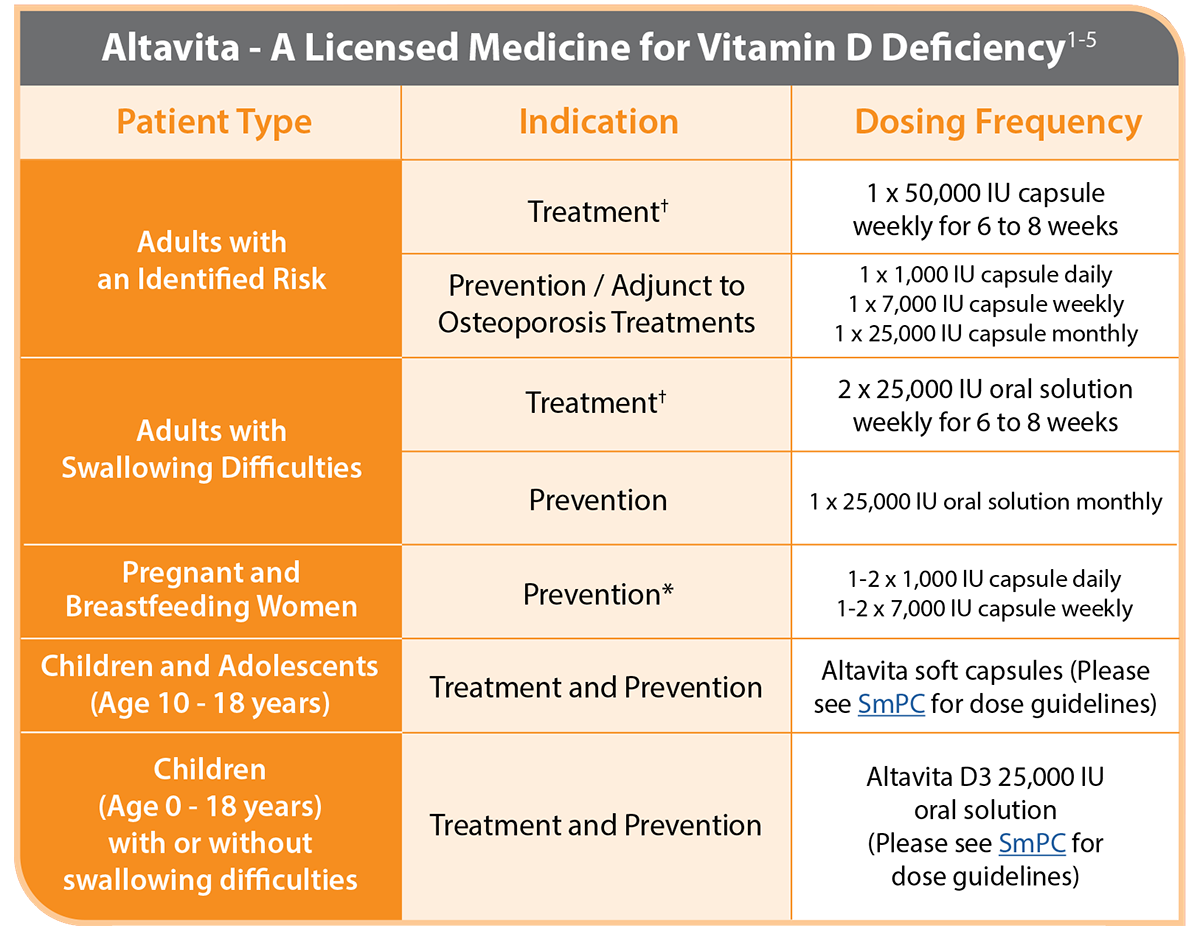 Altavita D3 offers a choice of 1 x Altavita 50,000 IU soft capsules or 2 x Altavita 25,000 IU soft capsules for the treatment of vitamin D deficiency (taken weekly for 6-8 weeks). ³⁻⁵