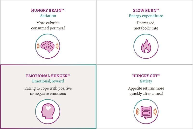 For some patients, this means addressing their cravings that can be associated with emotional eating which occurs when someone eats to cope with positive or negative emotions.2,3 This phenotype is called Emotional Hunger.