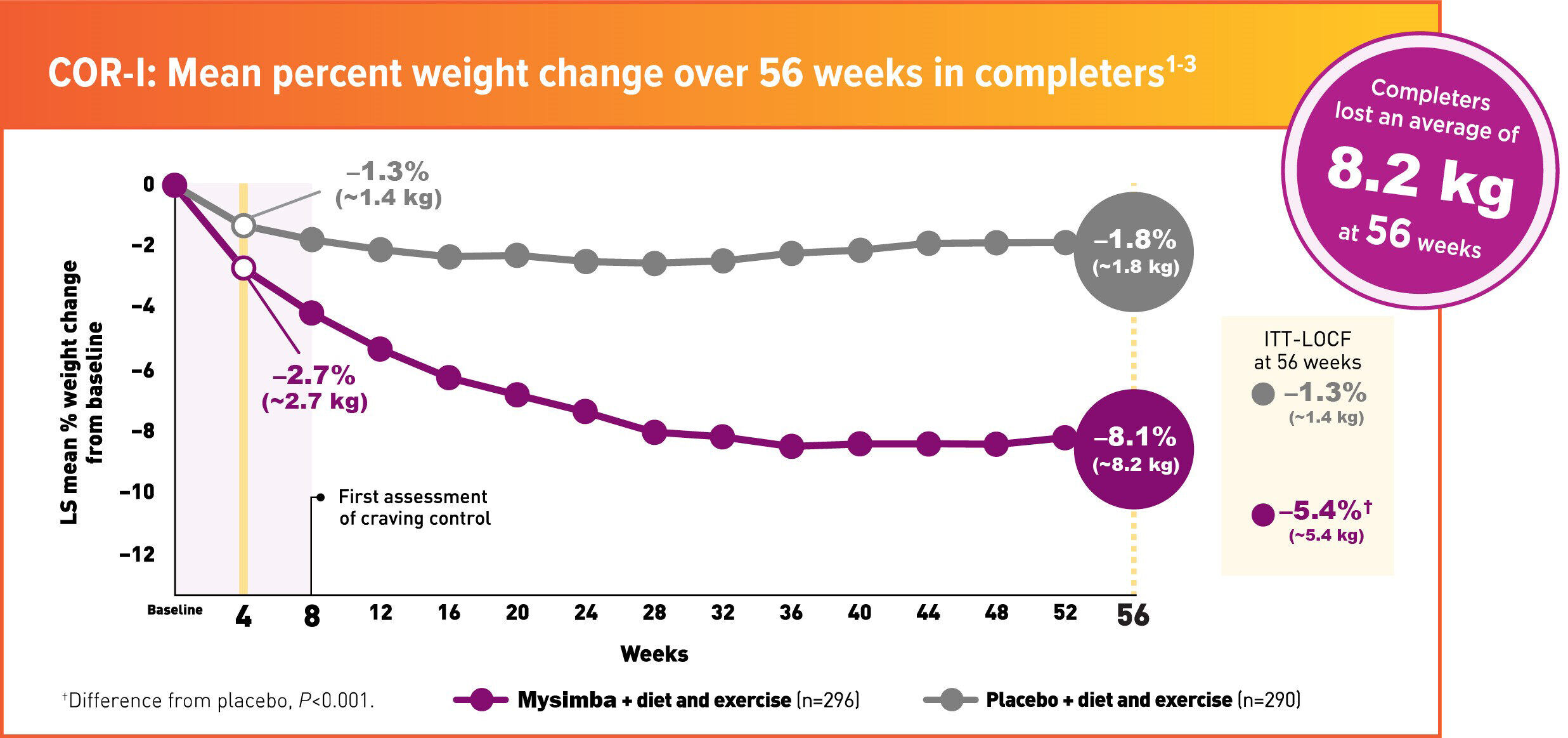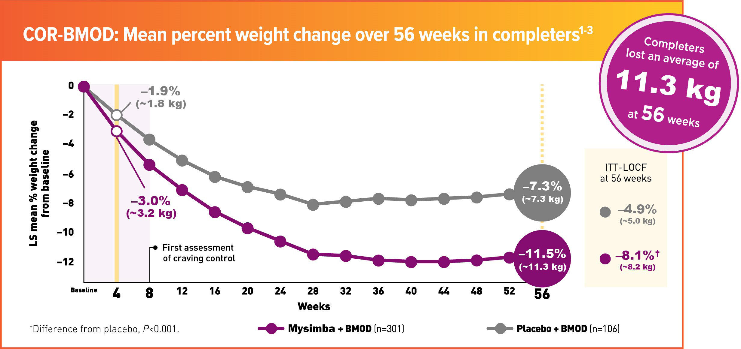COR-BMOD was a 56-week, multicentre, double-blind, placebo-controlled study. Patients were randomised to Mysimba® 32 mg/360 mg daily or placebo. The co-primary endpoints were percent change from baseline body weight and the proportion of patients achieving ≥5% reduction in body weight at Week 56. Unless noted otherwise, data shown are from the ITT analysis, which included all randomised patients who had body-weight measurements at baseline and at least once post-baseline. LOCF was used for missing data.1,2